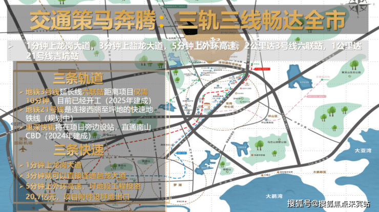 多维交通体系,通达畅行 三轨三线畅达全市,紧邻龙岗大道/盐龙大道/外环高速,30分钟到福田;地铁3号线延长线(在建中)六联站、21号线(规划中)吉坑站仅3分钟车程,深惠快轨数站直达南山。