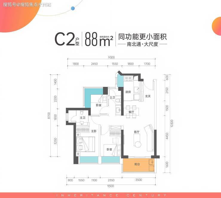 89㎡三房两卫:经典竖厅,三开间朝南,客厅开间3.5米,三分离卫生间设计,功能分区明确。