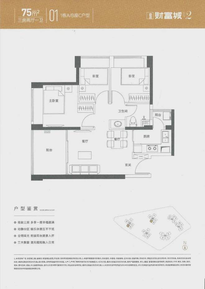 75㎡的3房2厅1卫,设计的是竖厅格局,客厅3.05米开间,3个卧室分别是3.1/2.85/2.25米的宽度,L型厨房,带1个小生活阳台,卫生间三段式分离设计,得房率约:76%(不含赠送),西南及西北朝向。