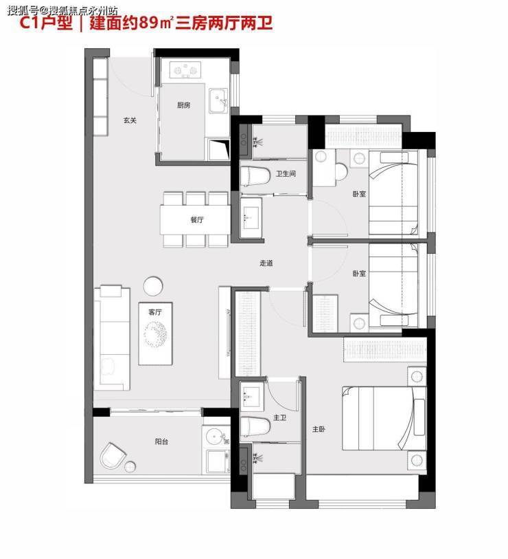C1户型|建面约89㎡三房两厅两卫:户型方正通透,全南向布局;客餐厅一体化;卧室全飘窗,雅致通透;贴心工卫设计、干湿分离。