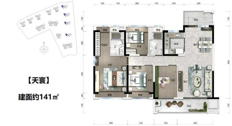 天寰组团首推12栋,建面约85-141㎡的3-4房,大都朝南分布,采光通风俱佳,实用率优秀。