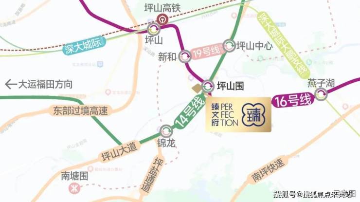 14/16号地铁线“坪山围站“F出口距离约370米,3站可到坪山高铁站,快速通往深圳北站,福田中心区,香港西九龙等,周边还有坪山大道,深汕路等主干道。