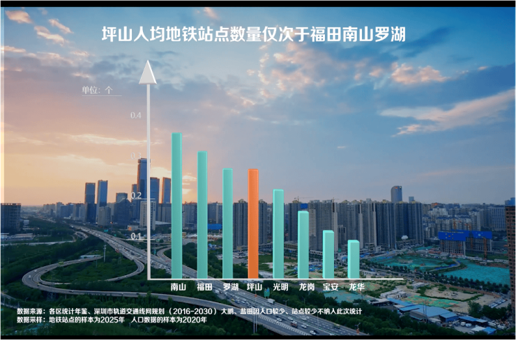 根据深圳市轨道交通线网规划(2016-2030),到2030年,全面进入地铁时代的坪山,人均站点数量仅此于福田南山罗湖。