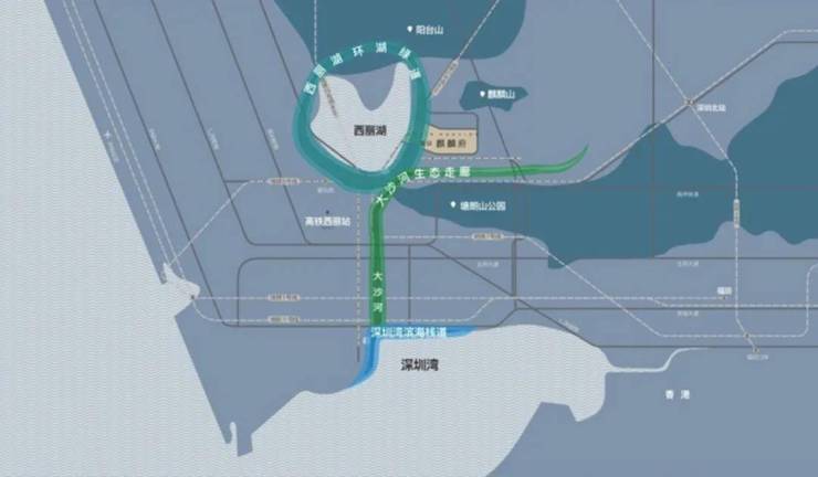 三山环抱,一湖为邻,千万顷珍稀原生资源,造就一席湖山大境;西丽湖环湖栈道+大沙河生态走廊+深圳湾环湖栈道,汇聚城市自然资源标地。