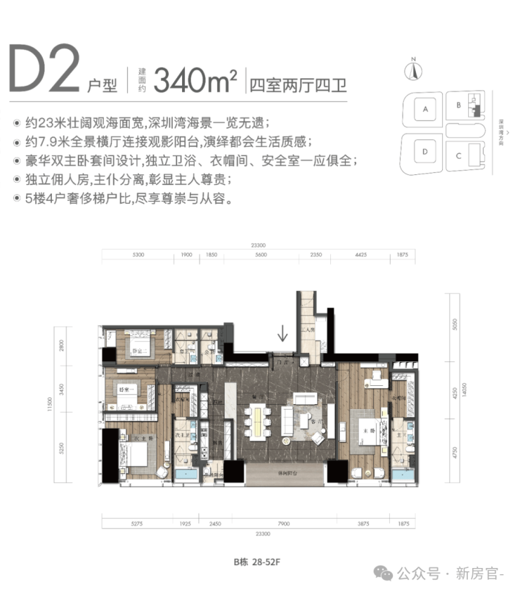 恒裕深圳湾4房户型为340、343平,总价区间为5227-7147万/套。