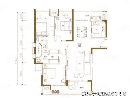 洋房户型;3室2厅2卫1厨, 建筑面积约98平米