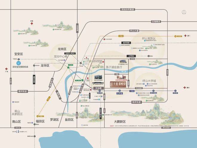 天健和悦府家门口就是16号地铁线“石井站”,1站到燕子湖可换乘后期的深惠城际大鹏支线,5站到坪山围可换乘14号线,10站到龙岗大运,15站到布吉,16站到罗湖,另外还有坪山高铁站,深大城际,可从深惠城际大鹏支线燕子湖站1站直达坪山站换乘。
