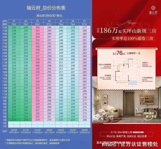 天健瑞云府于2025年4月3日取证入市,首推2栋1单元住宅,面积有76㎡的3房1卫,86-89㎡的3房2卫户型,共210套房源,备案均价3.24万/㎡,备案单价2.85-3.81万/㎡,总价217-340万/套,在2027年5月前带精装交房。(深圳坪山天健瑞云府售楼处官方电话:400-013-9098)