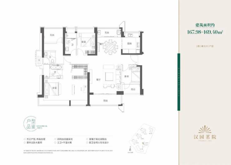 项目户型方正、布局合理,动静分区,其中168㎡五房户型为四阳台设计,客餐厅南北通透双阳台,豪华主卧大套房。