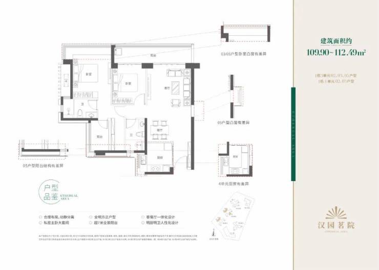 汉园茗院以改善型产品为主,户型面积包括109-112㎡三房两厅两卫、121㎡四房两厅两卫、157-159㎡五房两厅三卫和168-169㎡五房两厅三卫,户型设计非常不错,几乎都有偷面积把空间做大。