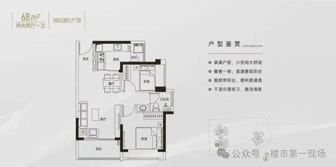 68㎡的2房2厅1卫,设计的是竖厅格局,客厅3.4米开间,LDKB一体化设计,动静分区,L型厨房带1个生活阳台,卫生间三段式干湿分离,得房率约79%(不含赠送),西南朝向。