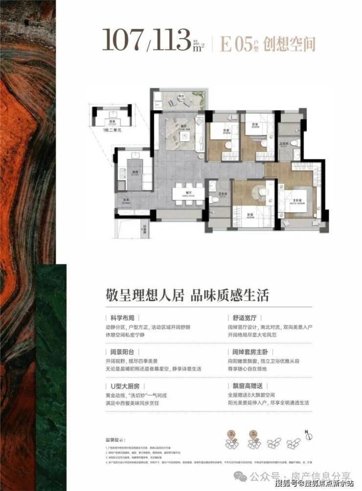 107-113㎡的4房2厅2卫,设计的是竖厅南北通透格局,进门入户玄关,LDB一体化设计,全屋8面飘窗,四开间朝南,U型厨房,卫生间干湿分离,得房率约76-81%(不含赠送),阳台主朝西北向。