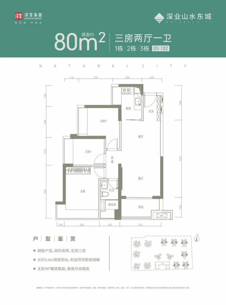 设计的是竖厅格局,客厅3.55米开间,LDKB一体化设计,3个卧室分别做到了3.75米/2.75米/2.4米的宽度,U型厨房,卫生间干湿分离,得房率:79.96%(不含赠送),阳台朝西南或东南向。