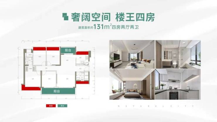设计的是横厅南北通透格局,客餐厅一体化,4个卧室分别做到了3.25米/2.55米/2.4米/2.15米的宽度,主卧南北通透,长5.2米的L型大阳台,U型厨房,卫生间干湿分离,得房率:79.96%(不含赠送),阳台主朝西南或东南向。