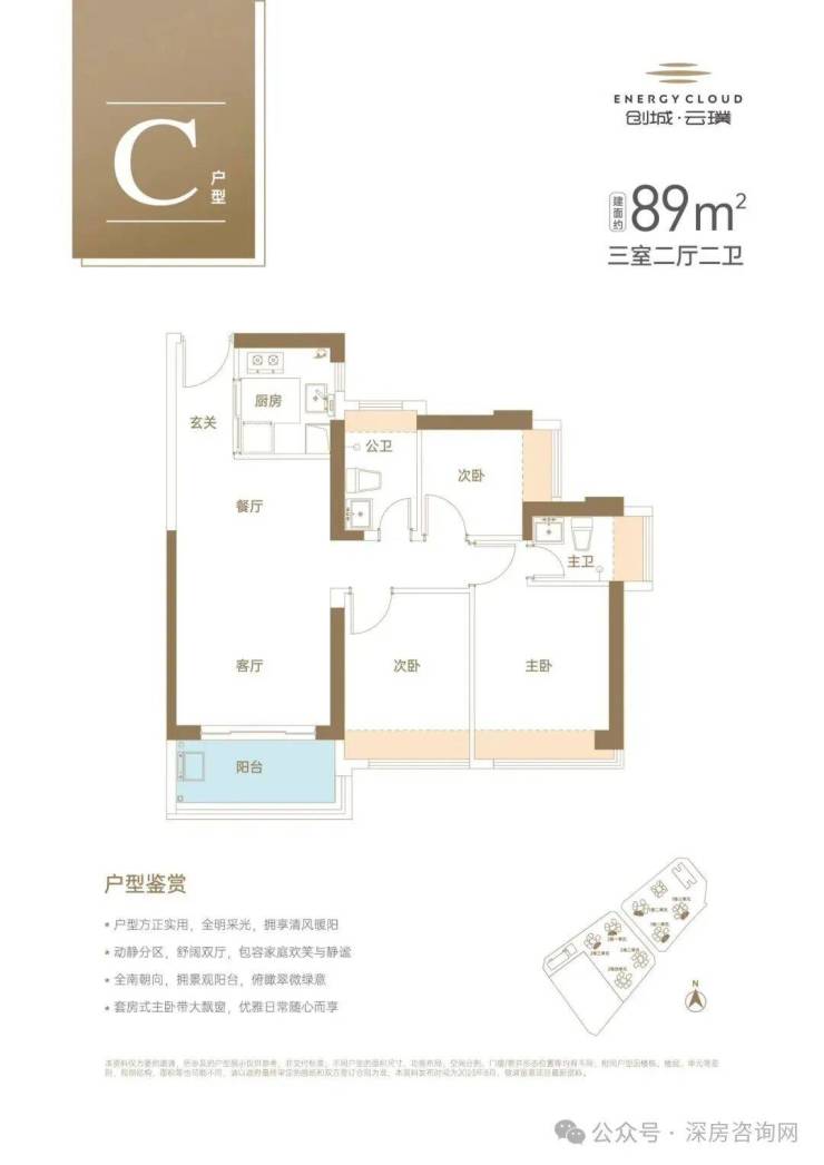 -89㎡3房2厅2卫:设计的是经典竖厅格局,LDKB一体化设计,客厅3.5米开间,三开间朝南,U型厨房,卫生间干湿分离,阳台有正东、西北、东北、东南、西南朝向。