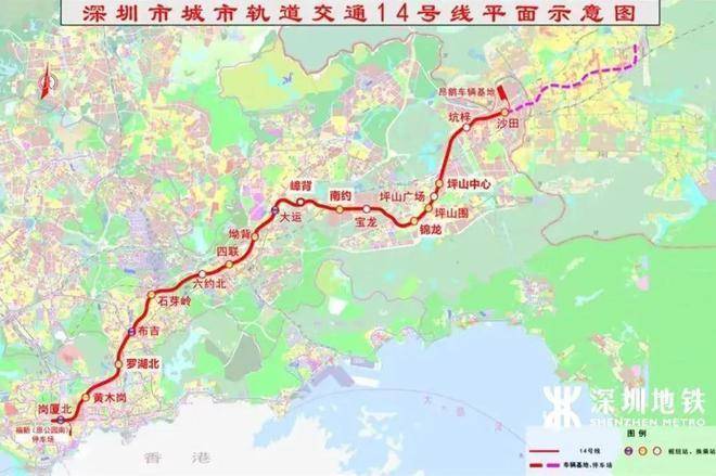 14号地铁线,该线路是从坪山沙田开往福田岗夏北的快速线,设计时速120公里,4站到大运,9站到布吉,10站到罗湖,12站到福田岗厦北,用时43分钟。