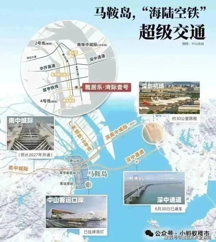 雅居乐湾际壹号雄踞翠亨新区马鞍岛南部中轴,占据着深中通道中山段唯一直接接驳点的战略位置。项目与深中通道出口仅3公里距离,通车后到达深圳宝安机场仅需30分钟,比深圳大部分郊区更便捷。