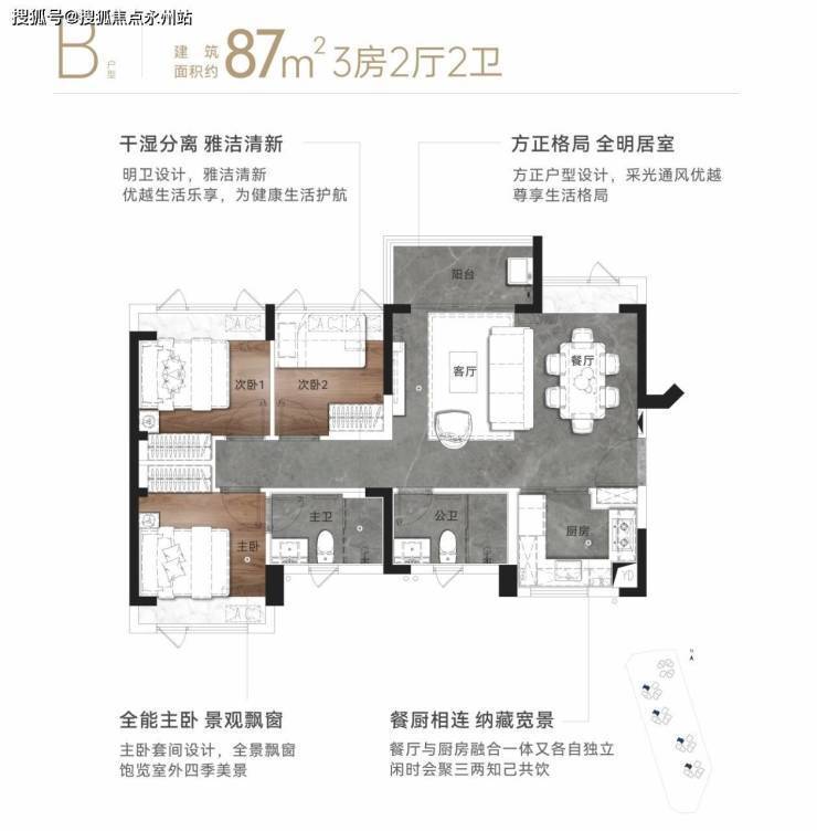 双套房主卧:主卧套内面积约20㎡,配备独立卫浴(干湿分离)、步入式衣帽间及全景飘窗,打造私密居住体验。