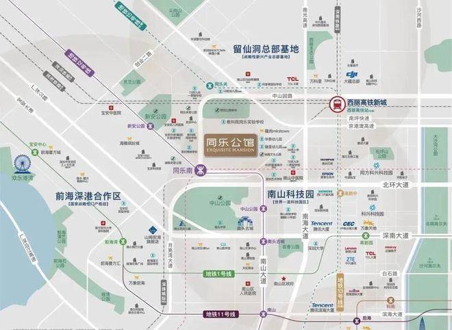 看下图,同乐公馆东面是南山科技园,西面是前海,南面是后海、深圳湾,北面是西丽留仙洞。