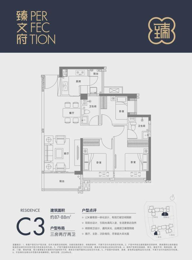87㎡的3房2厅2卫,设计的是经典竖厅格局,进门入户玄关,LDKB一体化设计,三开间朝南,L型厨房还带1个小生活阳台,卫生间干湿分离,得房率约85%(包含赠送),阳台朝东南向。