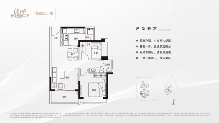竖厅南北通透格局,客厅3.4米开间,客餐厅双阳台分离化设计,U型厨房,卫生间干湿分离,得房率约79%(不含赠送),客厅阳台主朝东北向。