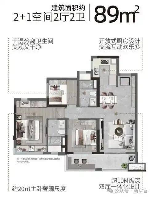 89㎡三房:6.5米景观阳台+四开间朝南,实用率近100%,主卧L型飘窗视野无遮挡。