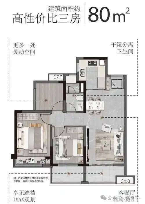 80㎡2+1房:竖厅动静分区,6.2米南向双开阳台,U型厨房预留双开门冰箱位。