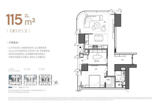 115-125㎡两房:采用LDK一体化设计,主卧带衣帽间或独立卫浴,适合两口或三口之家。