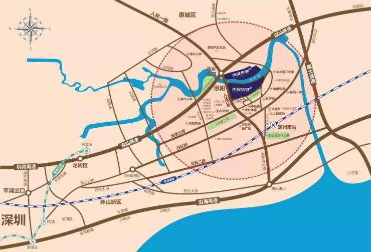 天安珑城项目位于惠阳淡水人民四路19号,即人民四路和淡水桥交接处,距深汕高速淡水出口仅800米,距离区政府约3分钟车程,处于惠阳中心区核心地段。