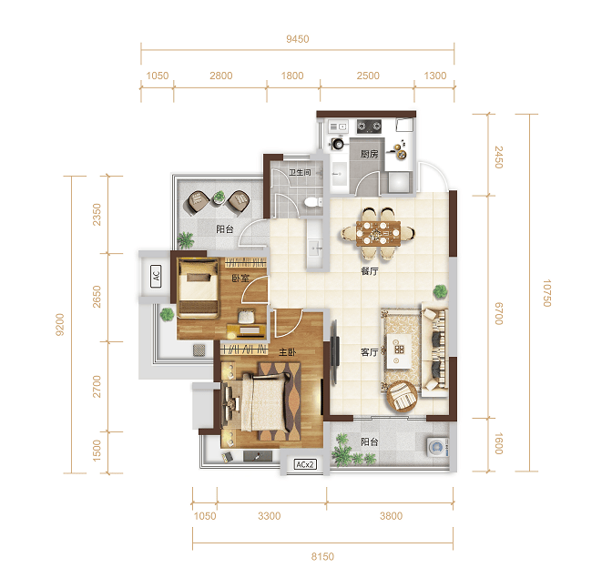 A1户型:83-88㎡两房一厅一卫
