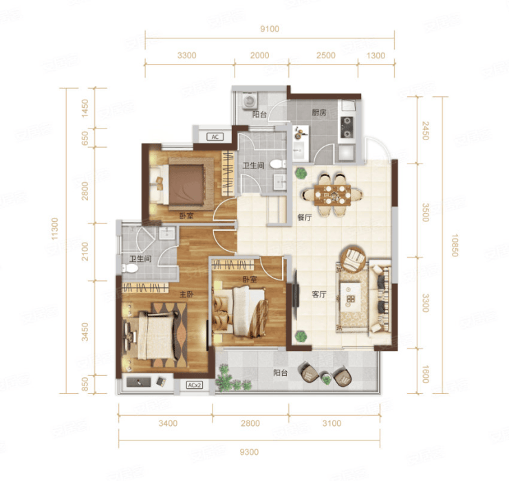 C户型:118㎡三房两厅两卫